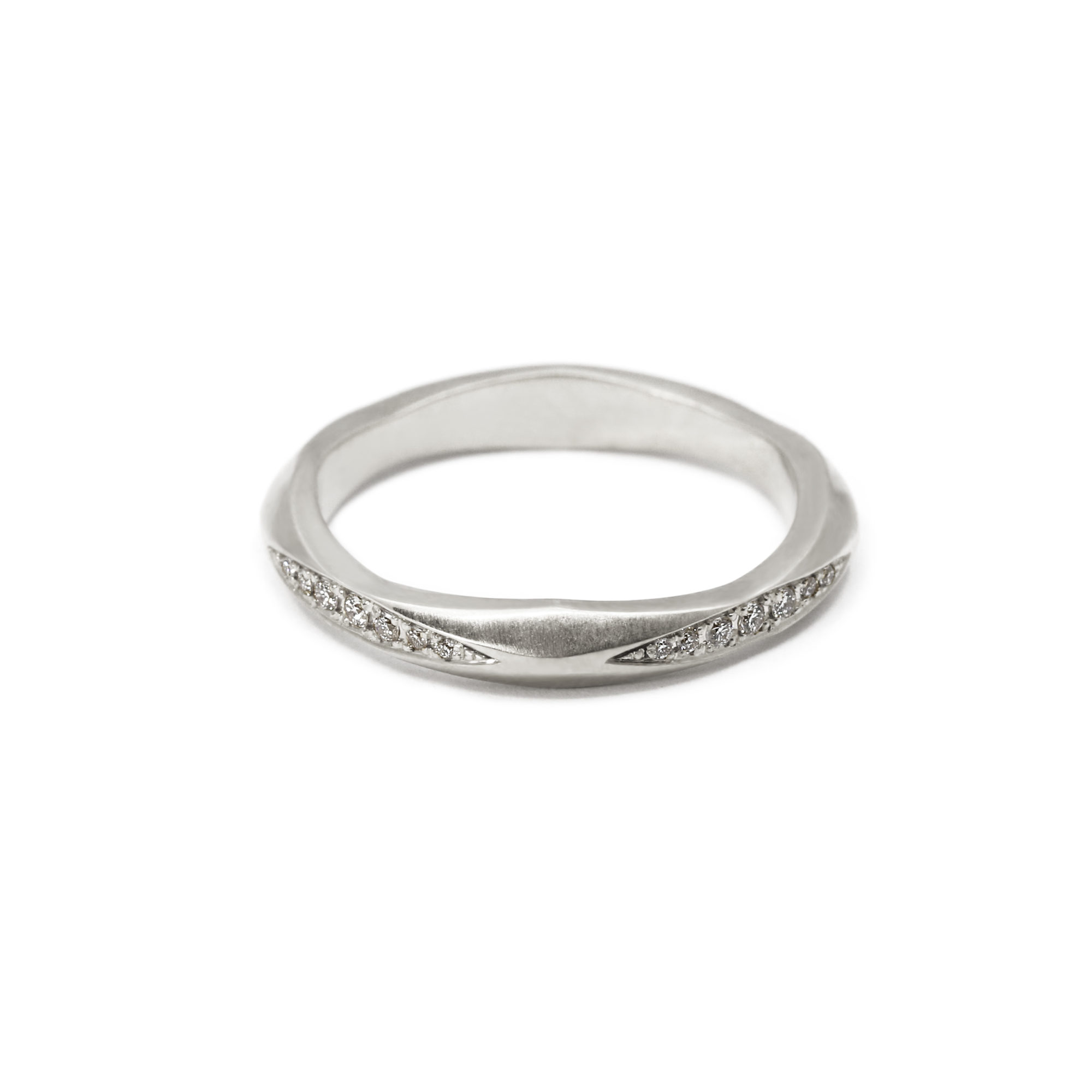 Certaines de ces facettes sont délicatement serties de diamants blancs, apportant de discrets éclats de lumière à l’ensemble. Ce contraste entre la sobriété veloutée du métal et la brillance des pierres précieuses crée un jeu de textures captivant, à la fois contemporain et sophistiqué.