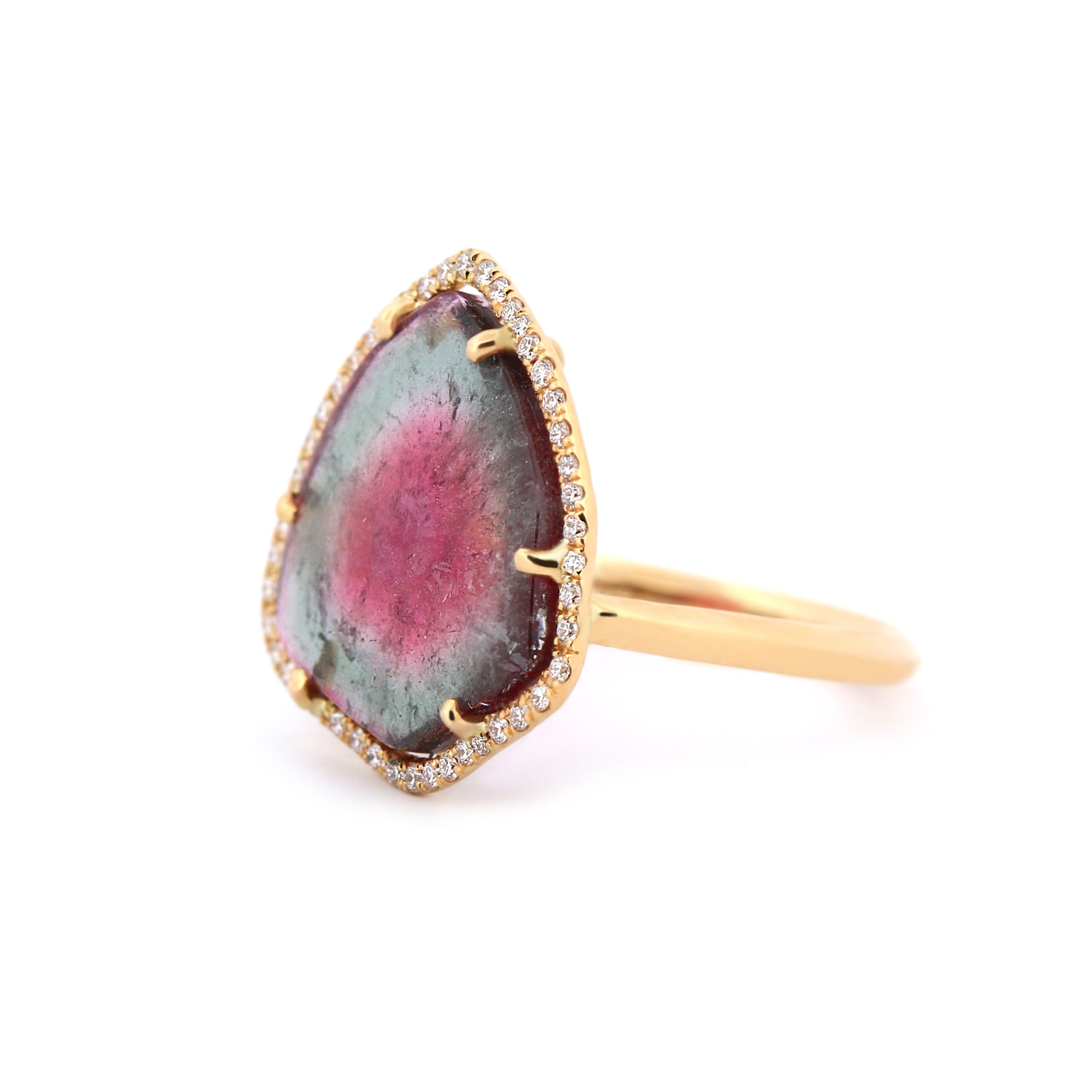 Cette bague en or jaune célèbre l’harmonie subtile entre éclat et douceur. En son centre, une tourmaline melon d’eau aux teintes envoûtantes de rose tendre et de gris fumé capte le regard par son dégradé naturel et sa transparence veloutée. La pierre, taillée avec finesse, semble suspendue dans la monture, comme une goutte précieuse figée dans le temps. Autour d’elle, 46 diamants sertis en halo dessinent une couronne étincelante, amplifiant la lumière et rehaussant les nuances délicates de la tourmaline. L’or jaune, chaud et solaire, complète l’ensemble avec raffinement, conférant à la bague une allure rare et poétique.