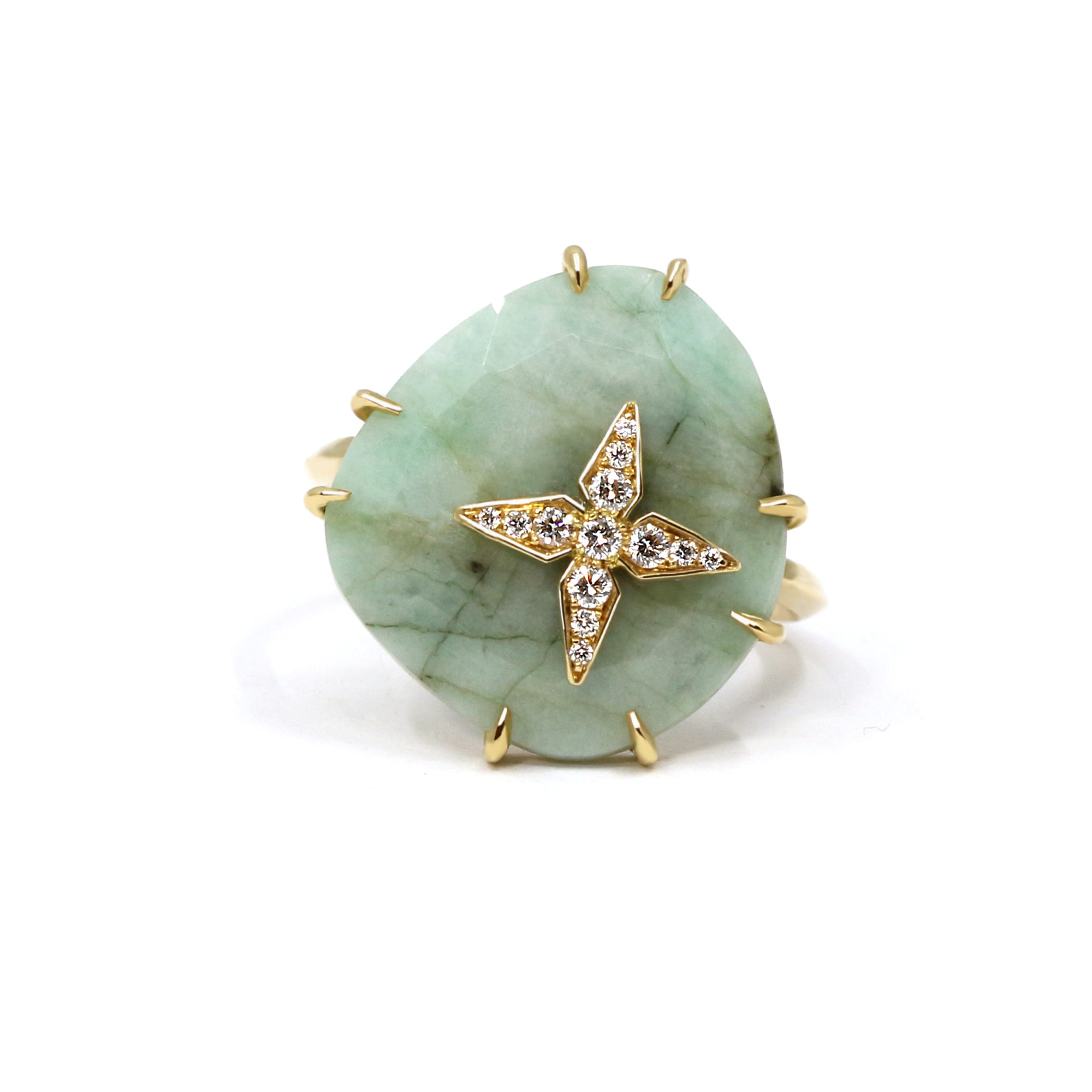 Cette bague magnifique en or jaune 18 carats met en vedette une émeraude brute rehaussée d’une étoile en or sertie de diamants étincelants. L’éclat naturel de l’émeraude brute contraste magnifiquement avec la précision des diamants, créant une fusion sublime de l’art brut et de la sophistication, un bijou d’une beauté exceptionnelle à porter au quotidien.
