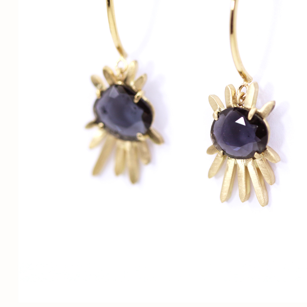 Géniales boucles d’oreilles en or 18ct recyclé suisse brossé. Nos yeux protecteurs donnent une touche funky à vos oreilles. Spinelles gris-bleu rose cut totalement irrégulières. On adore!