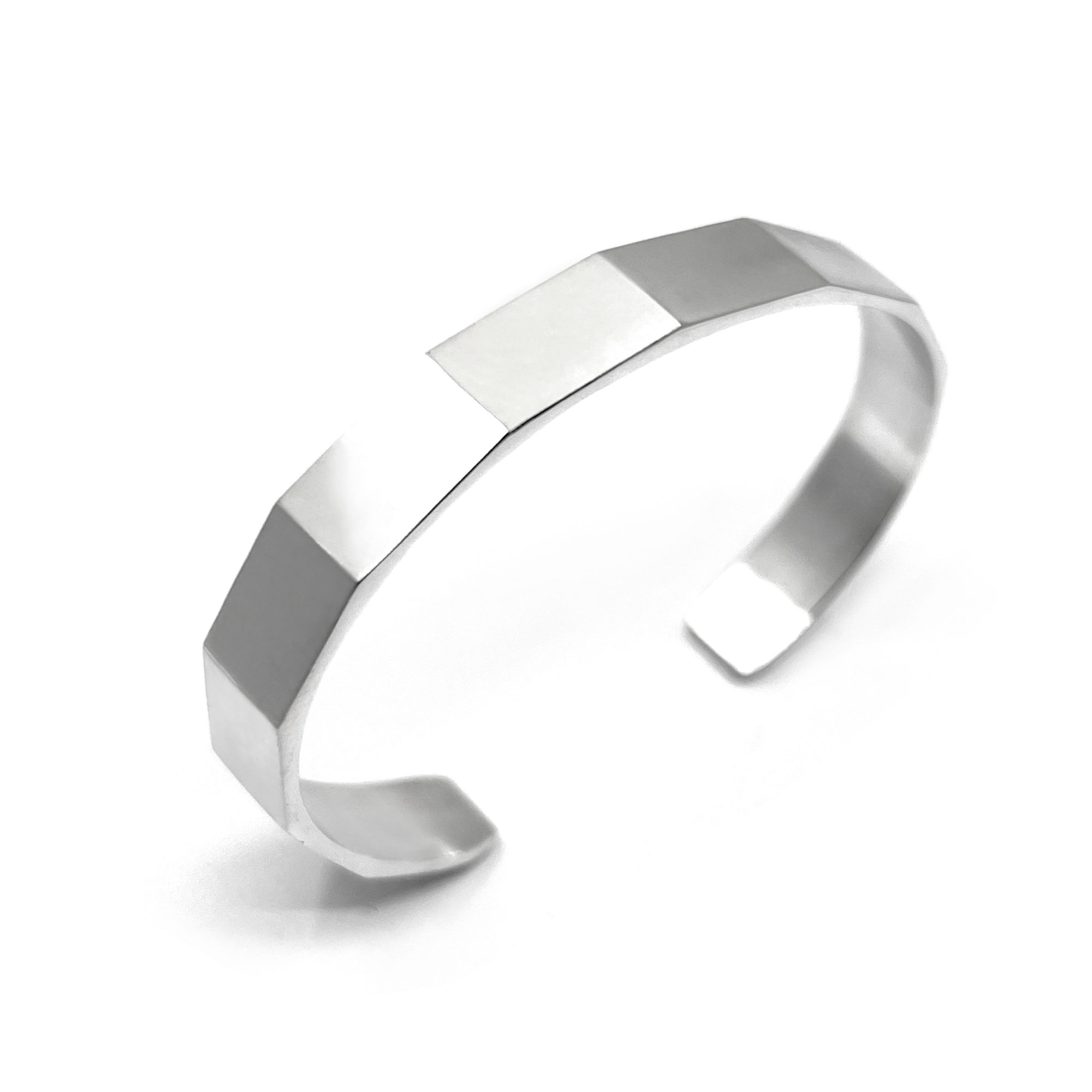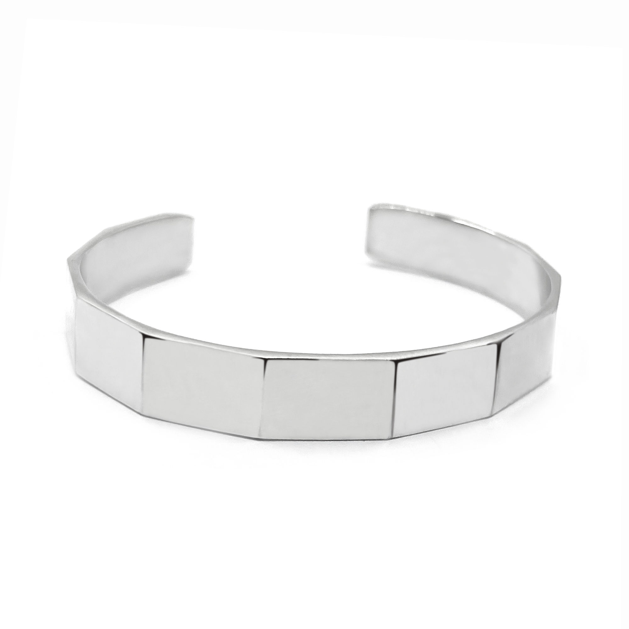 Très beau bracelet masculin en argent massif rhodié. Graphique et intemporel avec ses facettes brossées et son bord poli, il prend sa place avec élégance et caractère.