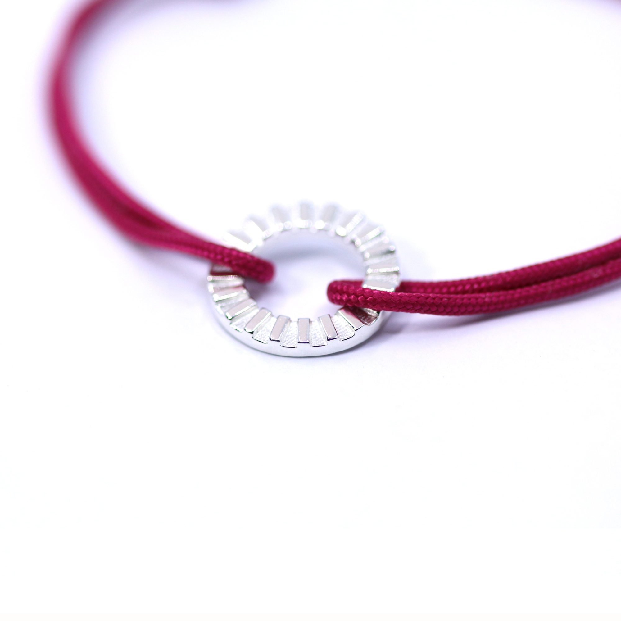 Très beau bracelet unisexe en argent massif qui reprend le motif du soleil cher aux Rêveries d’Eve. Monté sur cordon fuchsia, il apportera une touche chic et intemporelle à vos tenues.