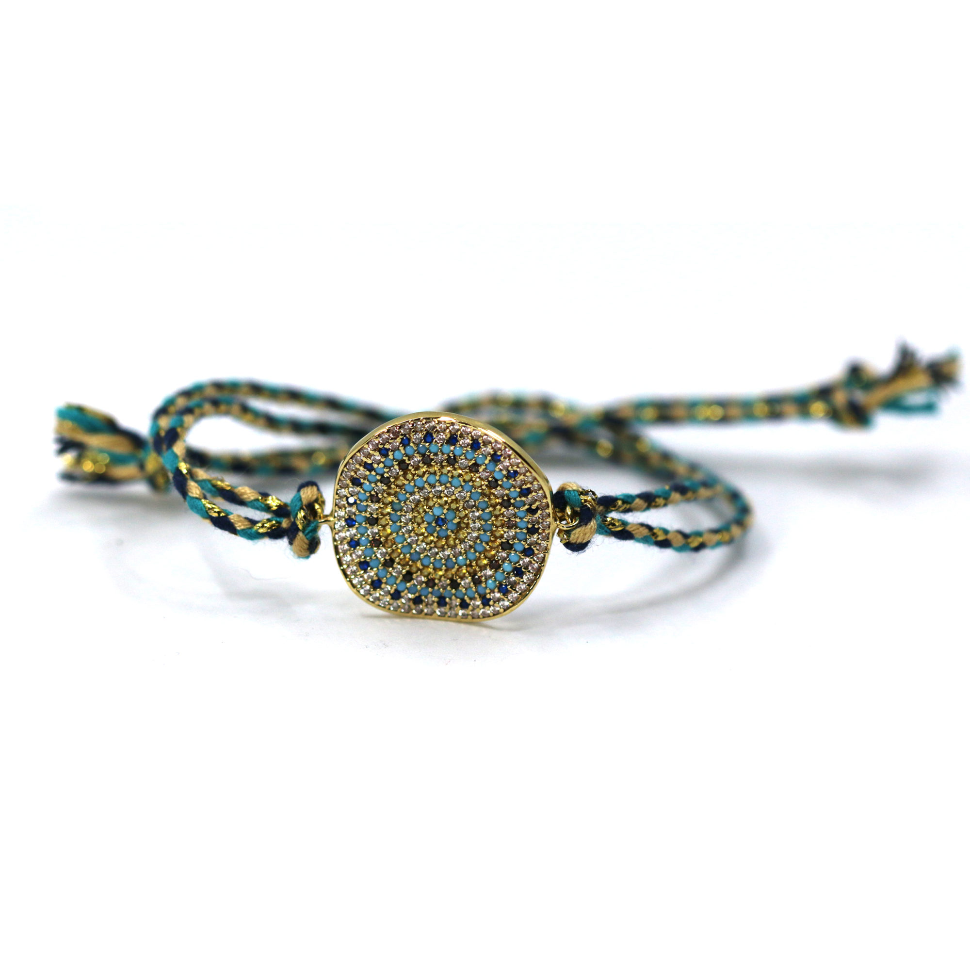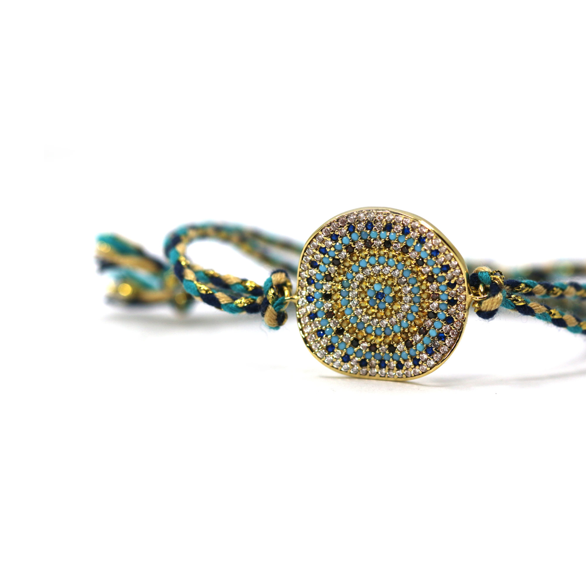 Craquez pour nos jolis bracelets Oeil Protecteur si bohème en argent plaqué or jaune ! Sertis de zircons colorés, ils donnent une touche précieuse et tendance.