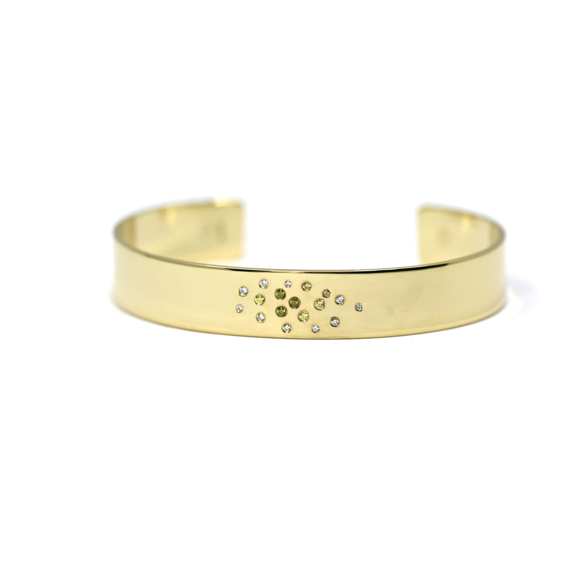 Magnifique bracelet jonc en argent massif plaqué or 18ct. Serti d’un dégradé de zircons verts olives, verts pâles, jaunes pâles et blancs, ce bracelet fait partie de la ligne Les Mystiques. Cette élégante pièce apportera une touche graphique à vos tenues tout en étant élégante et intemporelle.