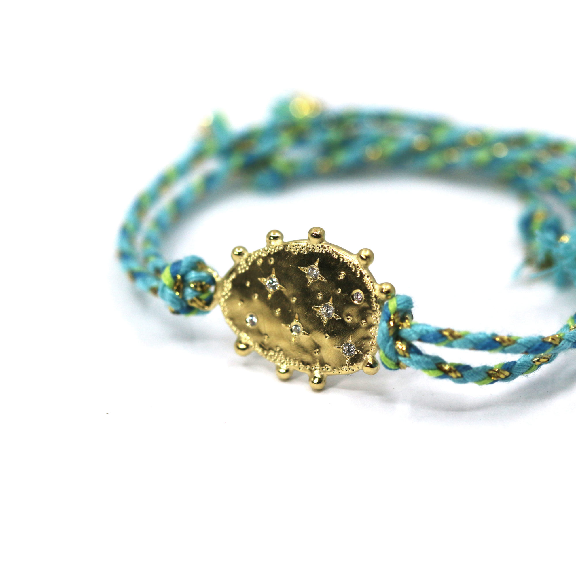- Cordon en coton dans les tons turquoises et fils métalliques