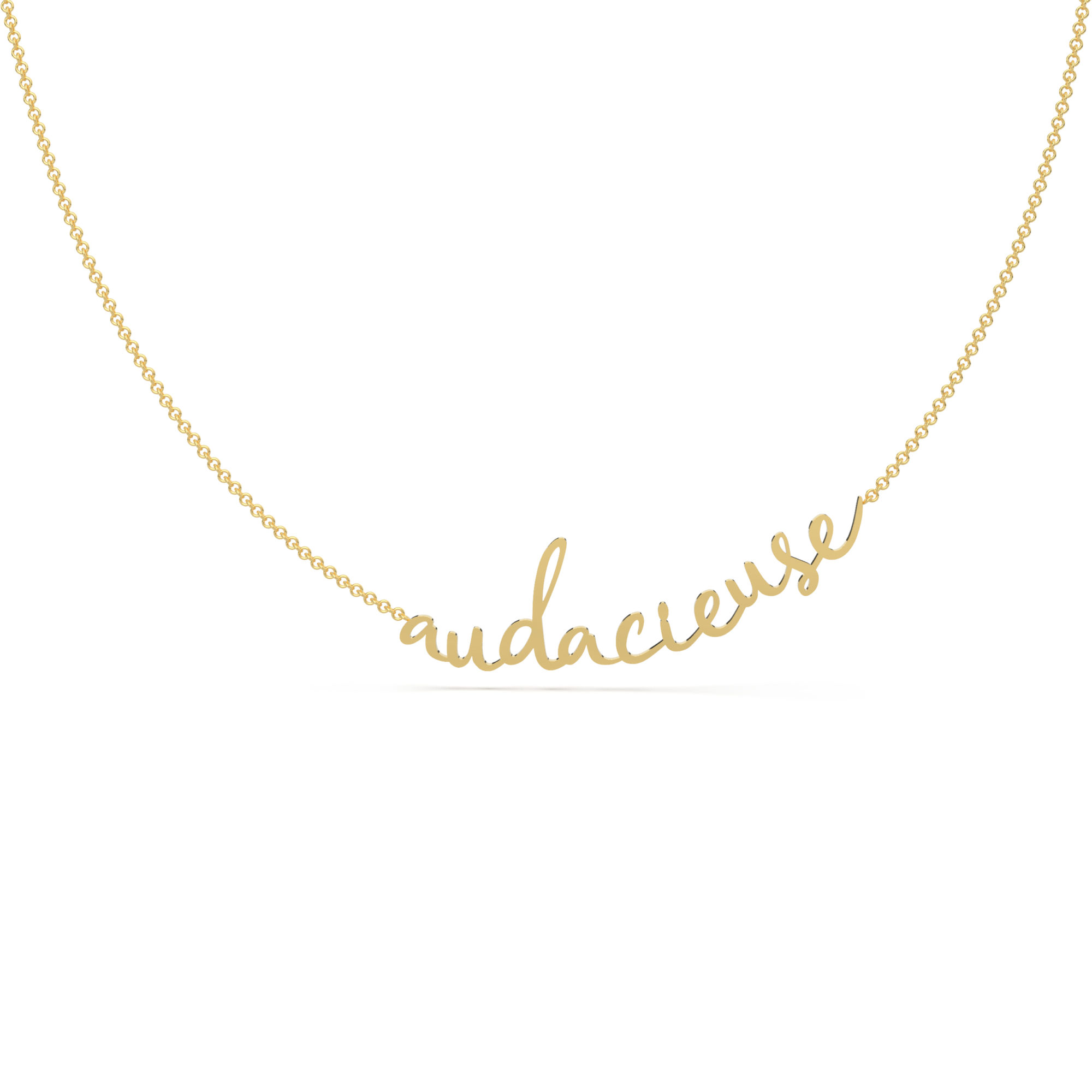 Ce collier en argent plaqué or 18ct rayonne d’audace avec son inscription “audacieuse”. Chaque lettre, en or brillant, incarne la force et la détermination. La finesse du collier souligne la précision de l’écriture, ajoutant une touche d’élégance contemporaine. Porté près du cœur, ce bijou devient un rappel constant de la force intérieure et du courage. Il célèbre la femme qui le porte, affirmant sa confiance et sa capacité à briller avec bravoure dans chaque situation.