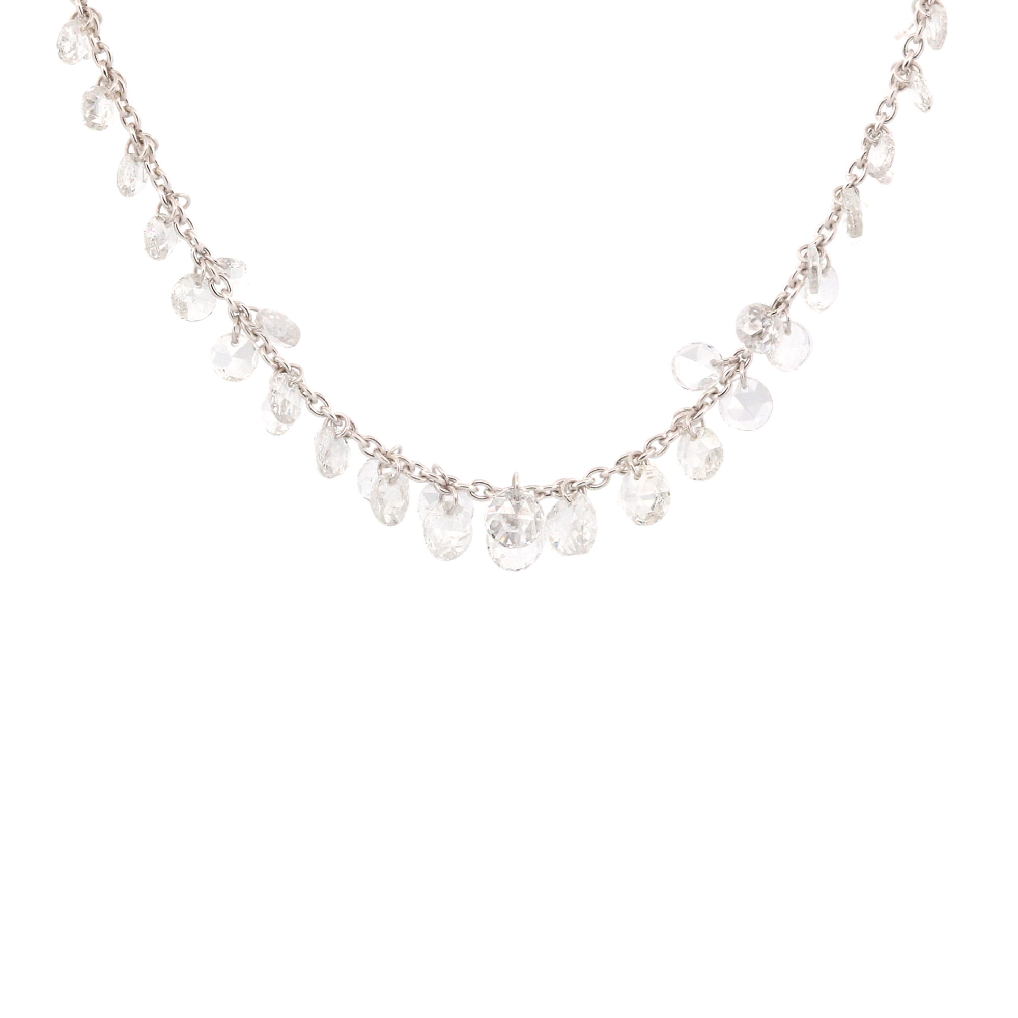 Ce somptueux collier en or blanc se distingue par l’éclat de 46 diamants en pampilles délicates. Chaque pierre, soigneusement suspendue le long de la chaîne, capte la lumière avec une grâce étincelante. L’or blanc 18 carats offre une toile lumineuse pour ces joyaux scintillants. L’ensemble évoque une sophistication contemporaine avec une touche ludique.