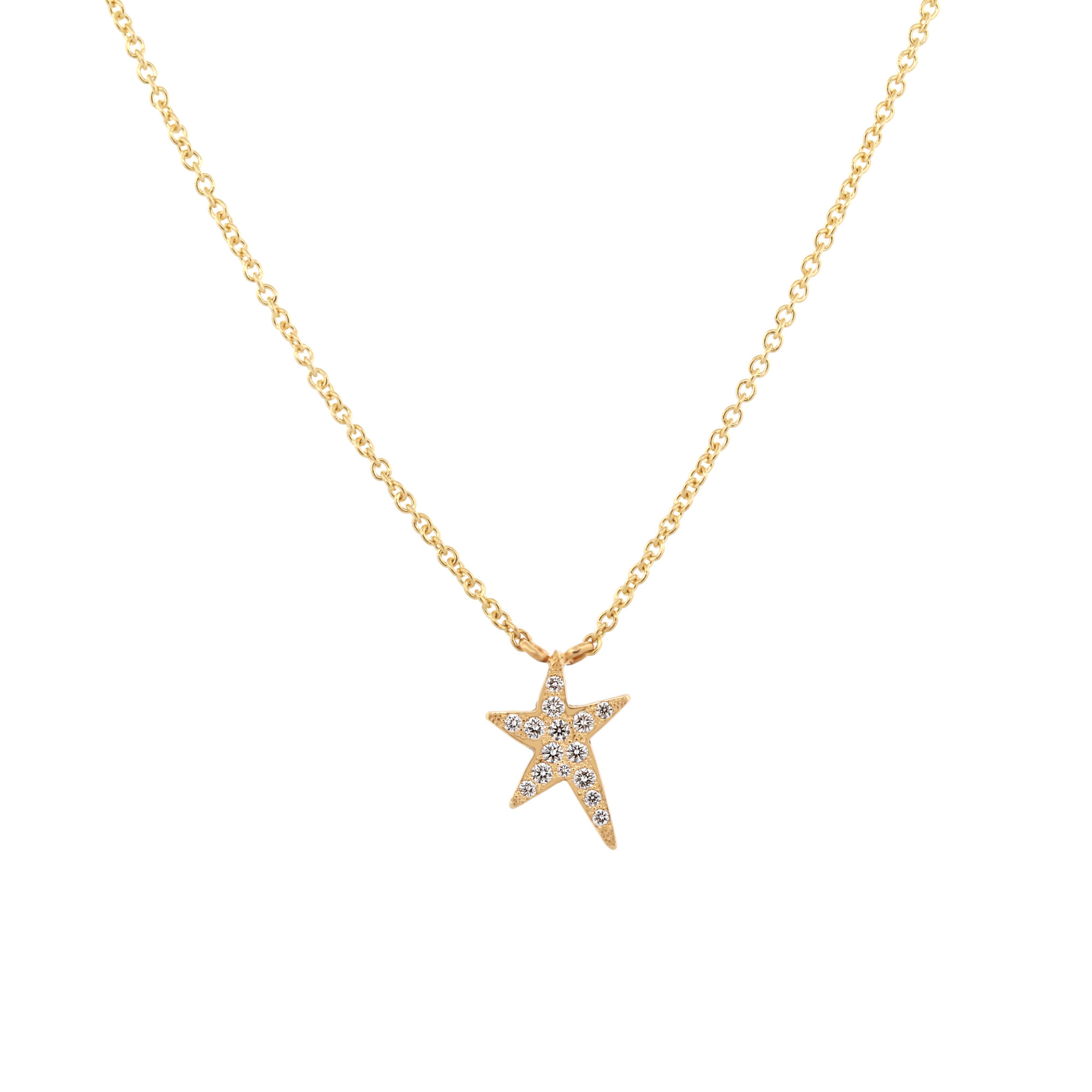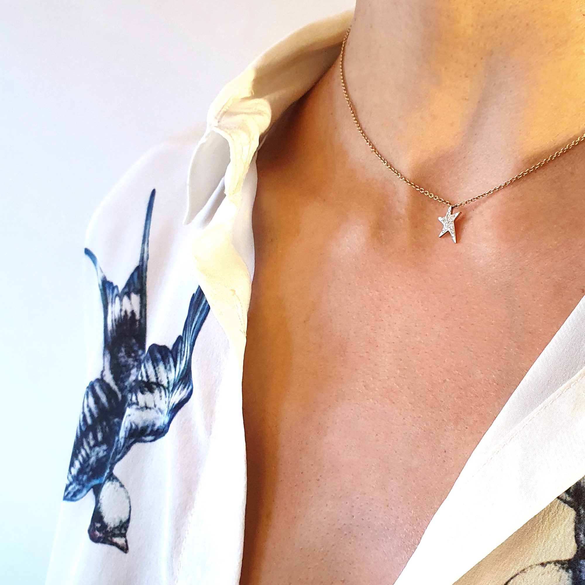 Collier en or jaune 18cts recyclé Etoile de la collection Les Constellations réalisé à la main en atelier à Genève. Avec son étoile pavée de 11 diamants qualité vs-si, ce collier se porte au quotidien avec d’autres colliers de la collection pour un effet de superposition tendance.