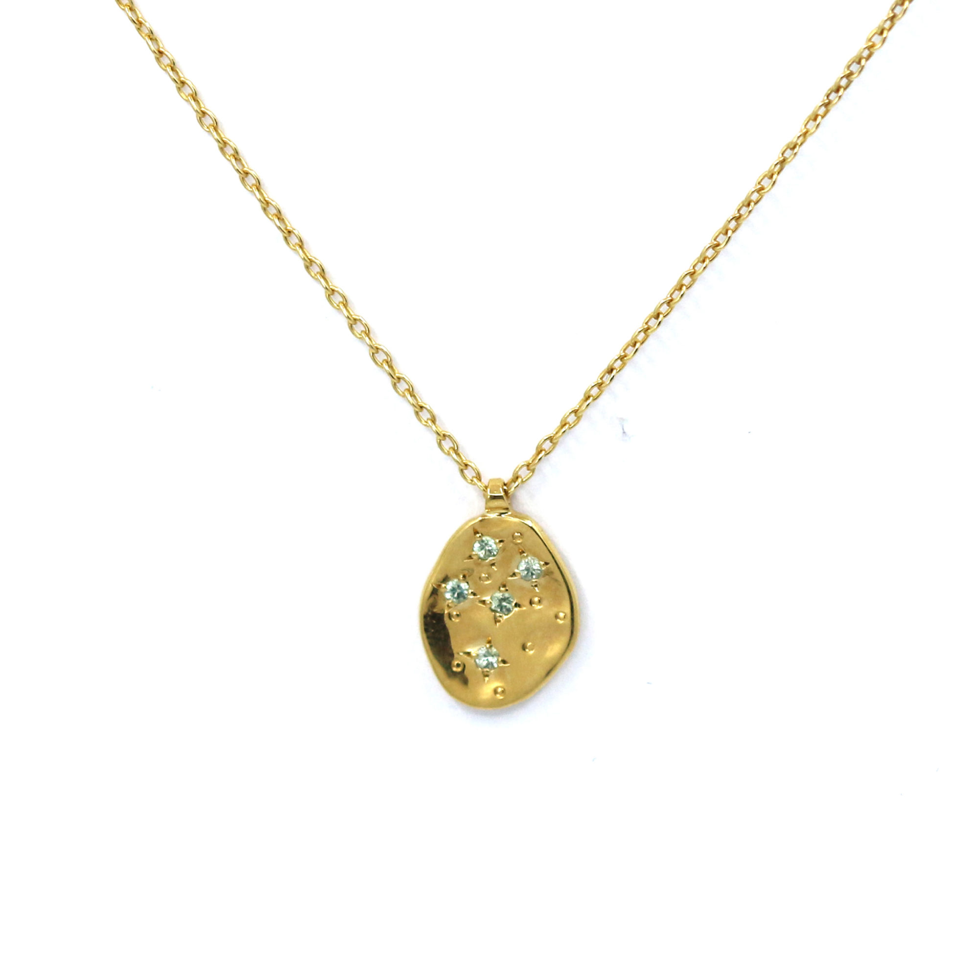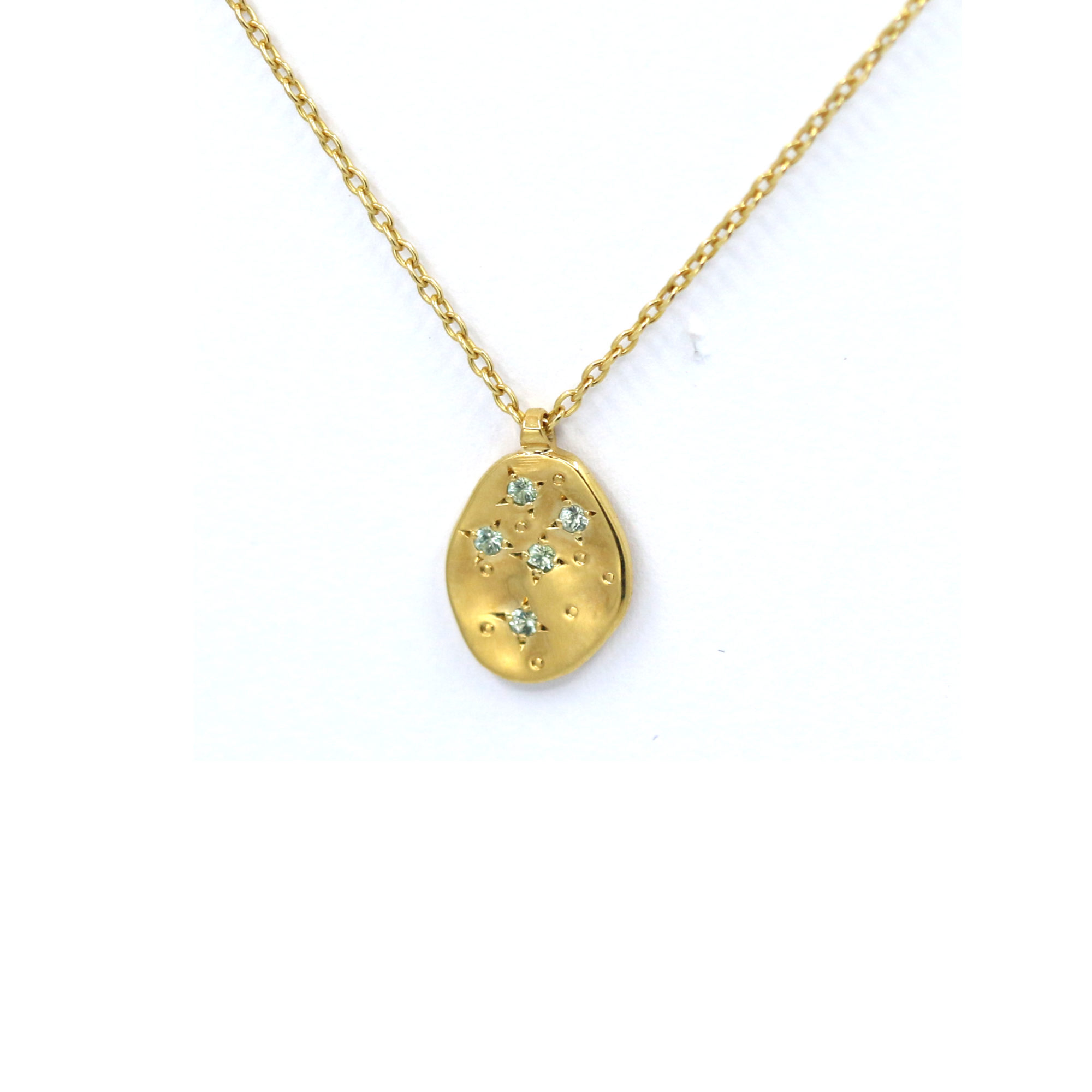 Collier Pluie d’Etoiles en argent 925 plaqué or 18ct. Pendentif serti de cinq saphirs verts pâles en étoile, il se porte comme un gri gri, contre le coeur.