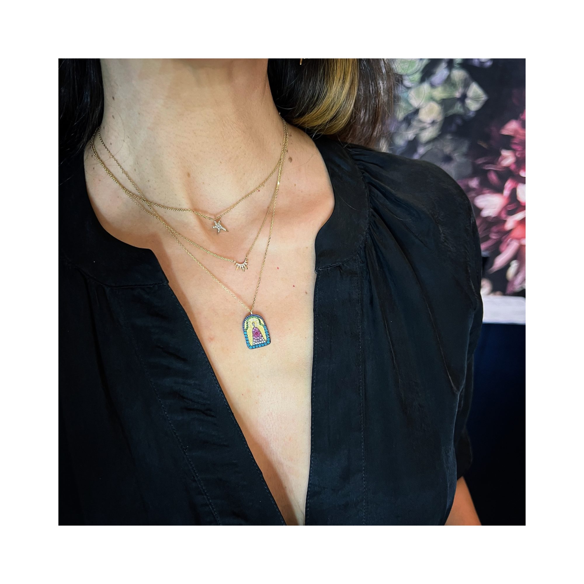 Ce collier incarne l’harmonie entre la simplicité et l’éclat, unissant la beauté intemporelle de l’or avec la richesse chatoyante des pierres précieuses. La conception scapulaire ajoute une touche de spiritualité et de tradition. Porté, ce collier n’est pas seulement une déclaration de style, mais une célébration de croyances profondes, fusionnant l’esthétique contemporaine avec la signification héritée, pour une élégance qui transcende le temps.