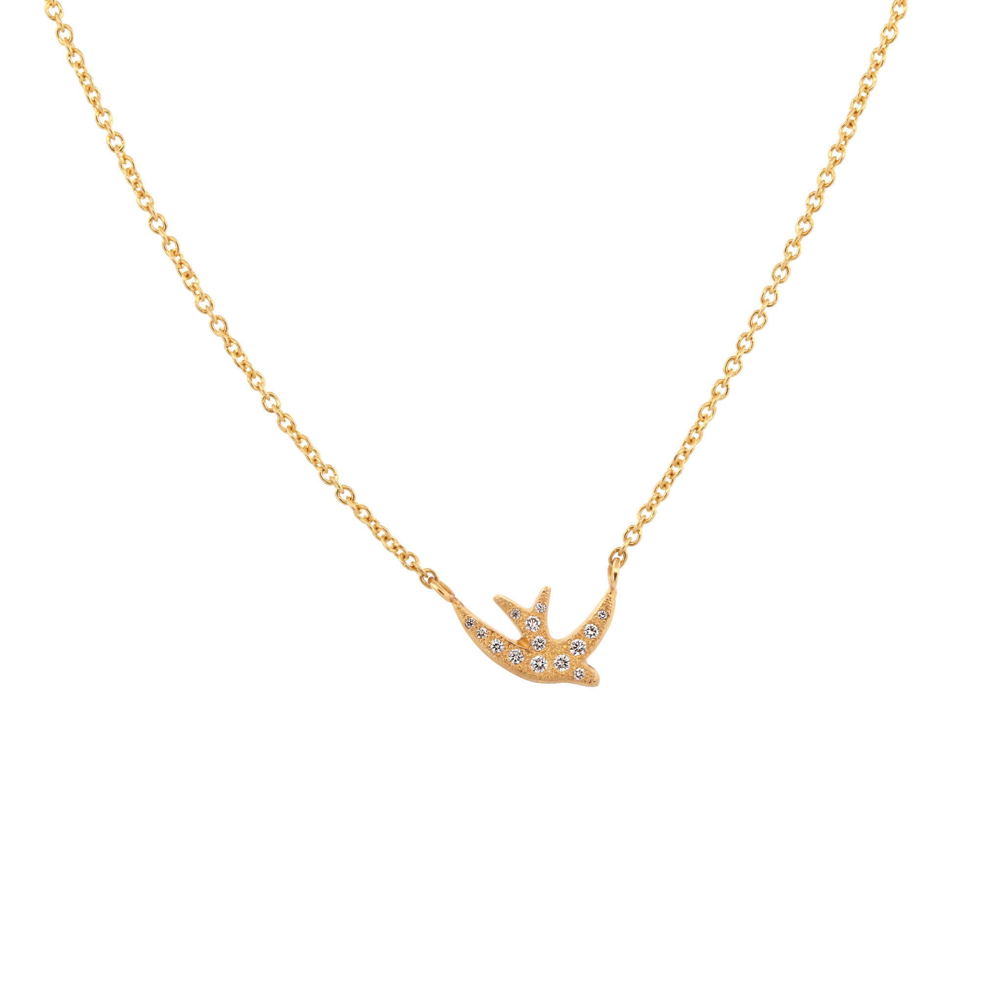 Très beau collier en or jaune recyclé 18ct. Avec ses 18 diamants sertis, ce délicat symbole de liberté vient voler et scintiller au creux du cou. Il se combine avec d’autres modèles pour un effet tendance du plus bel effet. Tous les bijoux sont uniques et chaque hirondelle est différente.