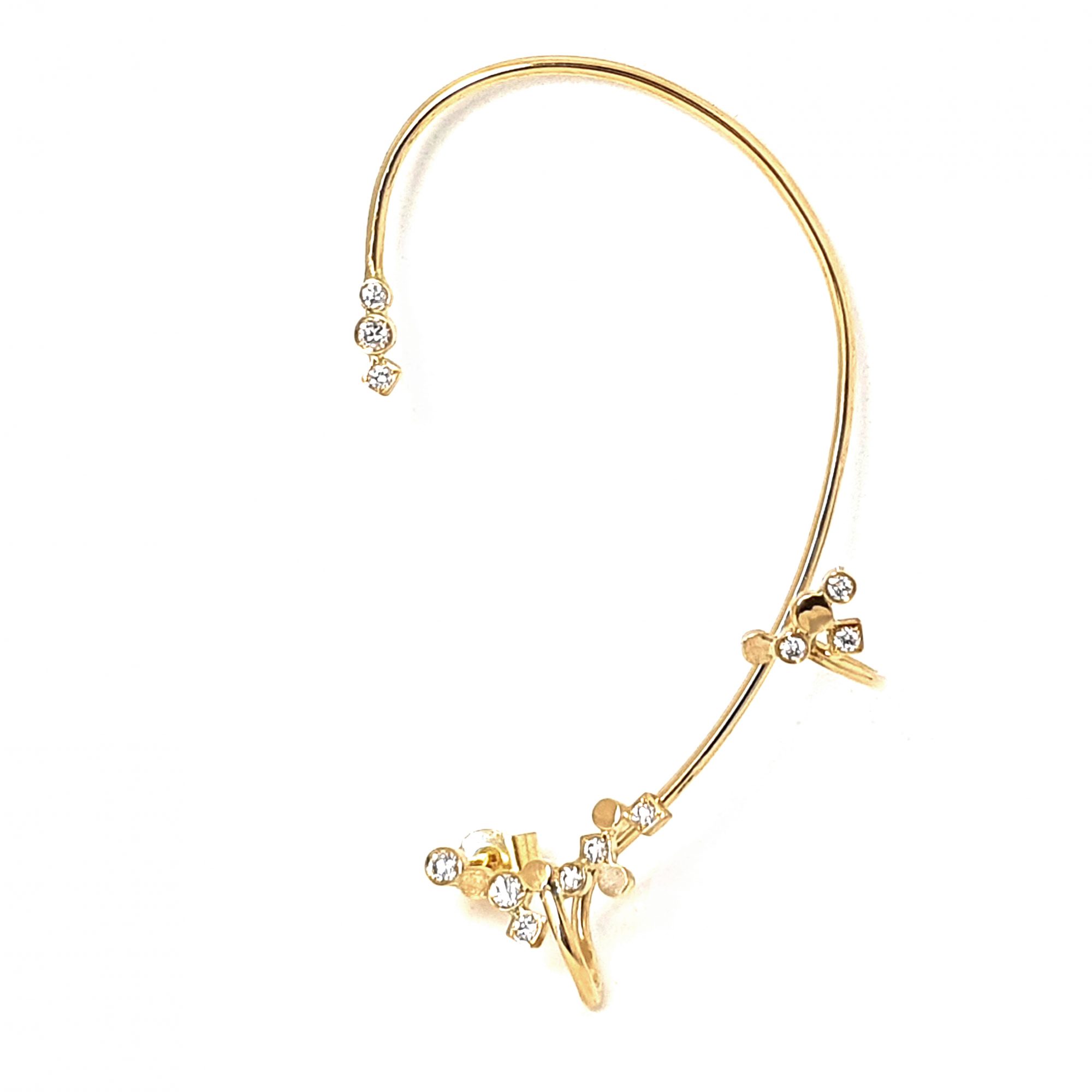 Sublime tour d’oreille en or 18cts et 12 diamants de qualité vs-si. La boucle vient se lover autour de l’oreille pour un effet de piercing tendance où les diamants scintillent autour de l’oreille comme des étoiles dans le ciel.