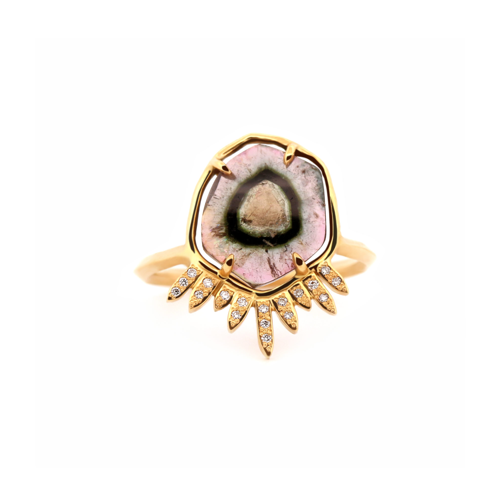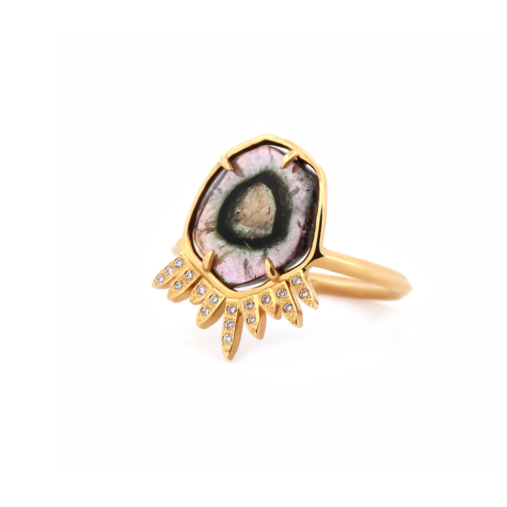 Somptueuse bague en or 18cts sertie de 18 diamants. Ses rayons rappellent les auréoles de la Vierge dans les églises gothiques et la pierre dans sa complexité de couleurs est totalement mystique.